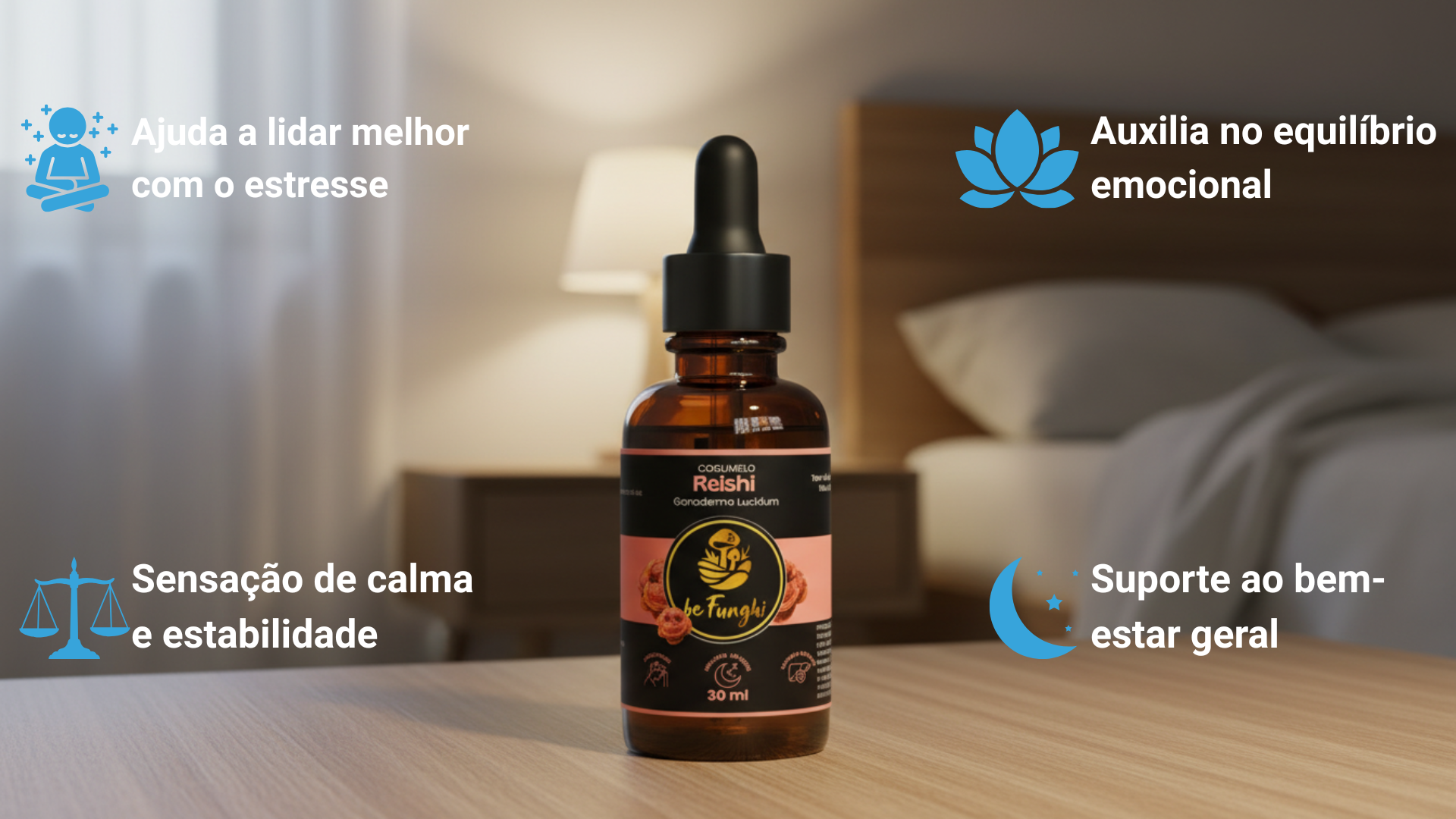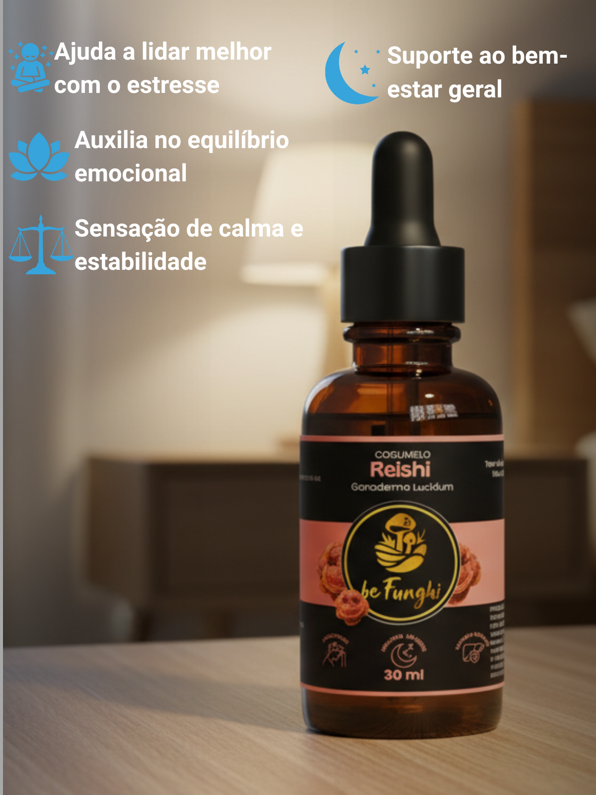 O Reishi 30ml foi desenvolvido para apoiar o equilíbrio emocional e ajudar o corpo a lidar melhor com o estresse do dia a dia, promovendo uma sensação maior de calma e estabilidade, sem sedar e sem comprometer a clareza.