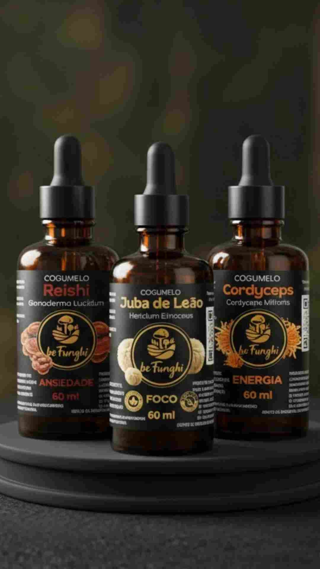 O Kit BeFunghi 60ml reúne extratos de Juba de Leão, Cordyceps e Reishi, três cogumelos tradicionalmente utilizados em diferentes culturas no dia a dia.